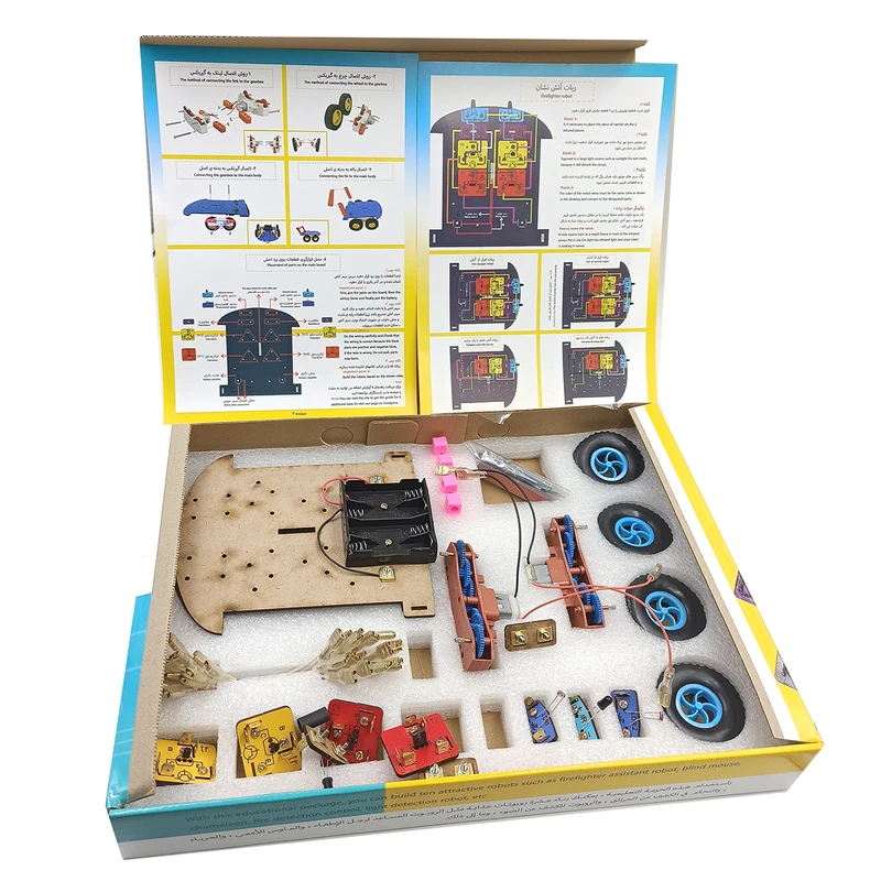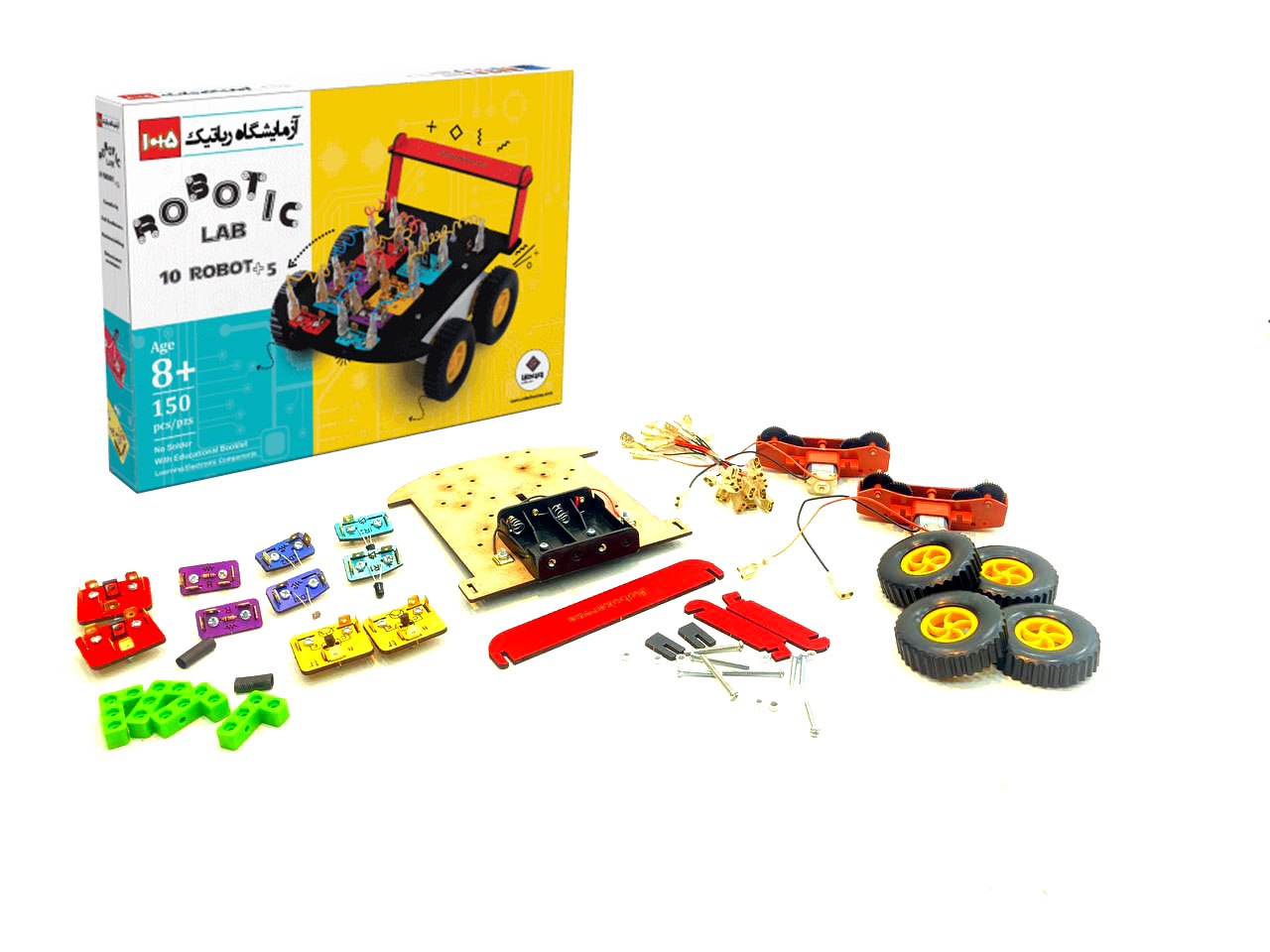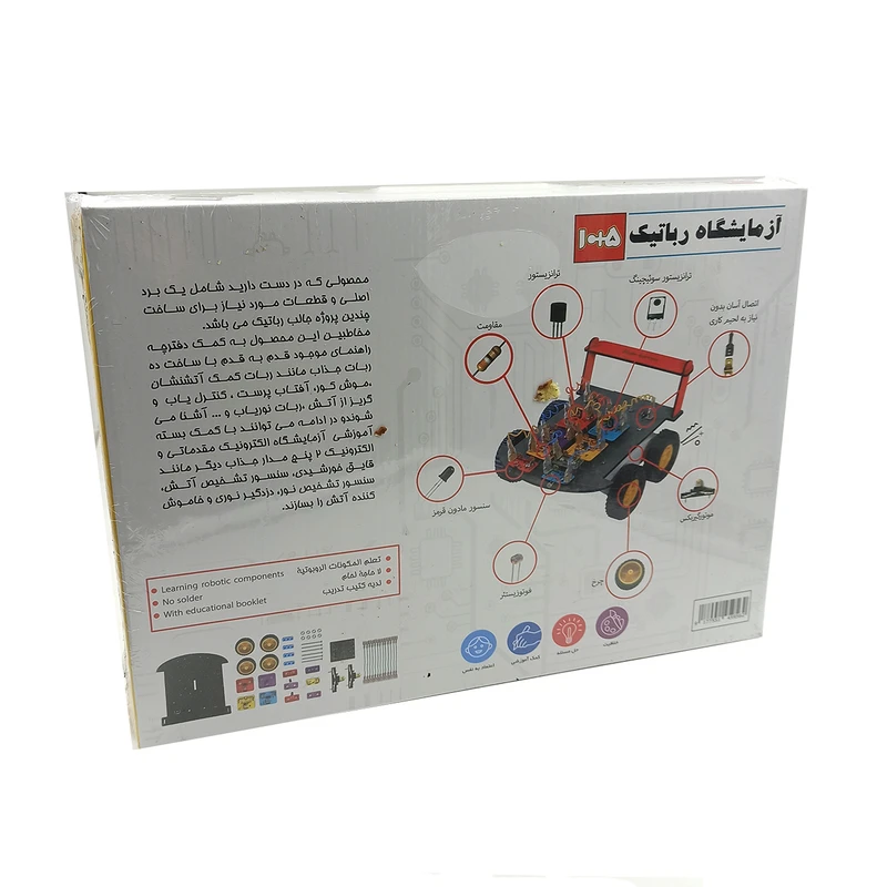 بسته آموزشی آزمایشگاه رباتیک شامل ساخت 10 ربات جذاب به همراه 5 ربات با کمک کیت آزمایشگاه الکترونیک می باشد. مدار های کاربردی بدون نیاز به لحیم کاری مناسب برای پروژه های دانش آموزی است. این کیت آموزشی برای کودکان 8 سال به بالا طراحی شده است. کلیت ربات در 4 مرحله راه اندازی می شود : مرحله اول اتصال لینک به گیربکس، مرحله دوم اتصال چرخ ها به گیربکس، مرحله سوم اتصال گیربکس به برد اصلی و مرحله چهارم اتصال باله به برد اصلی از جمله ربات هایی که می توان با این محصول آزمایشی ساخت : ربات موش کور، ربات فرار از نور، ربات تعقیب نور، ربات آتش نشان، و ربات فرار از آتش و ..