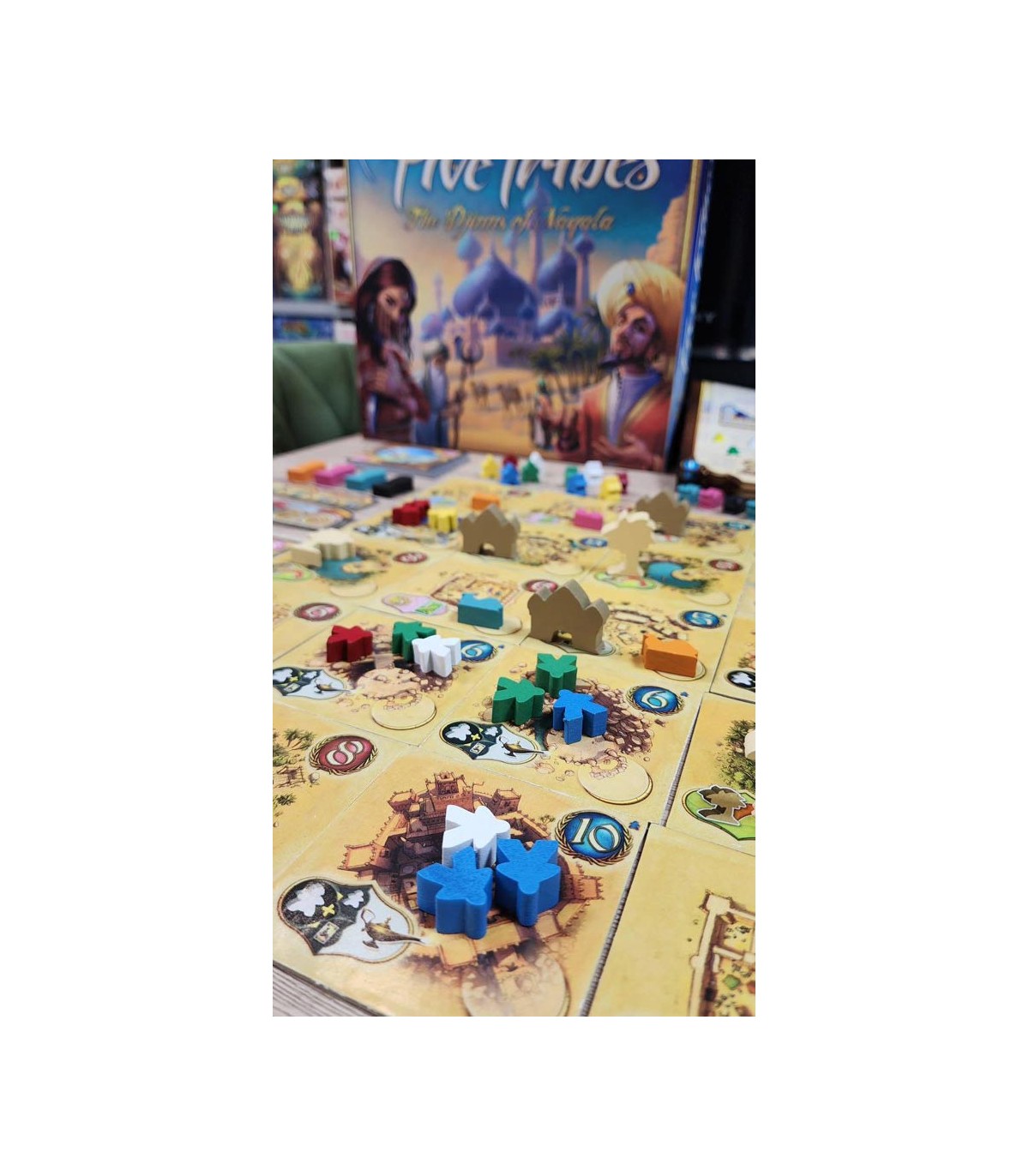 در واقع بازیکنان در بازی Five Tribes باید با کمک قدرت های هر قبیله و همچنین کارت های جن، زمینهای مختلف بازی رو تصاحب کنند و شترهای خودشون رو در زمین تصاحب شده قرار بدند.