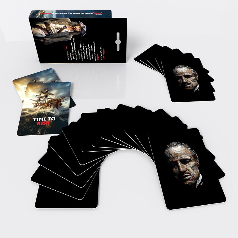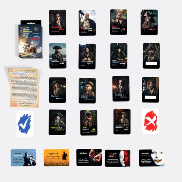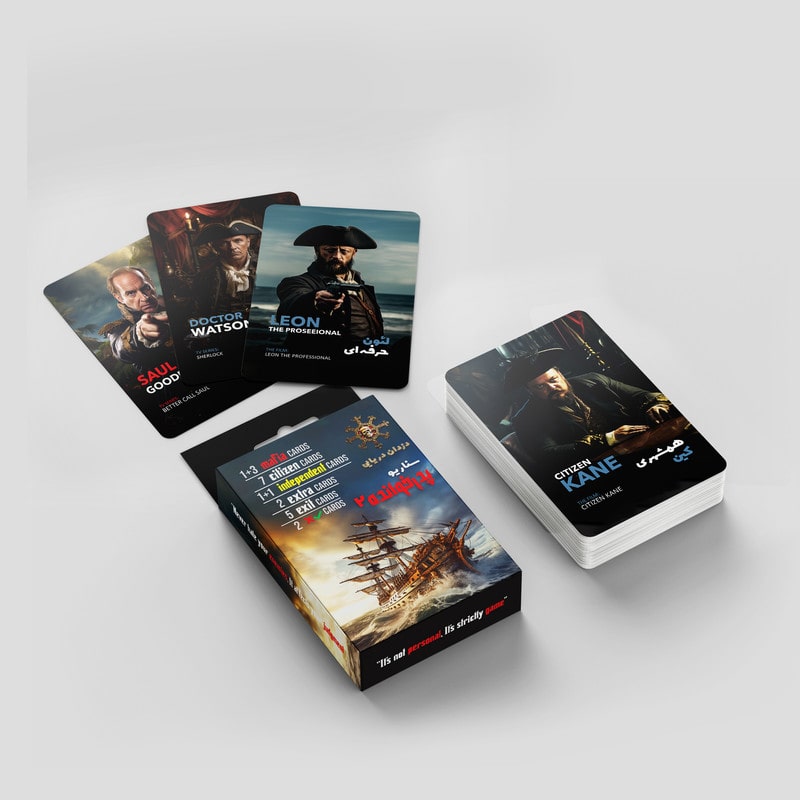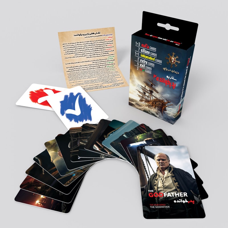 بازی فکری مدل کارت مافیا سناریو پدرخوانده 2 دزدان دریایی دارای 22 کارتی میباشد ( 1+3 کارت مافیا ، 7 کارت شهروند ، 2 کارت مستقل ، 2 کارت بی نام و 5 کارت خروج و 2 کارت قرعه مرگ) مجموعه کارتها برای بازی 15 نفری به همراه گرداننده به روش پدرخوانده پلتفرم فیلم نت طراحی و تولید شده است :برای آموزش روش بازی و توضیح نقشها ، برگه راهنما درون محصول مفصل توضیحات را ارائه میدهد – قصد اولیه طراحی و تولید این محصول صرفا کمبود کارت کامل و مقرون به صرفه در بازار بود ، در نتیجه پس از استقبال علاقه مندان و دریافت نظرات متعدد ، اقدام به تولید این محصول نیز نمودیم . جنس کارتها گلاسه 145 گرمی دورو چاپ با روکش سلفون مات بوده که مقاومت آنها را چند برابر می کند.