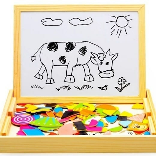 وایت برد مگنتی یک اسباب بازی آموزشی است .کودک میبایست شکلهای مختلف دفترچه را با پیدا کردن قطعات در هم ریختهی درون جعبه بر روی تخته ی وایت برد بسازد. کودک با خیال پردازی و تخیلات خود تکههای پازل را روی وایت برد میچسباند.