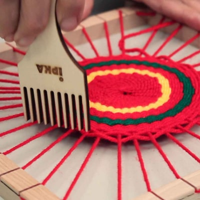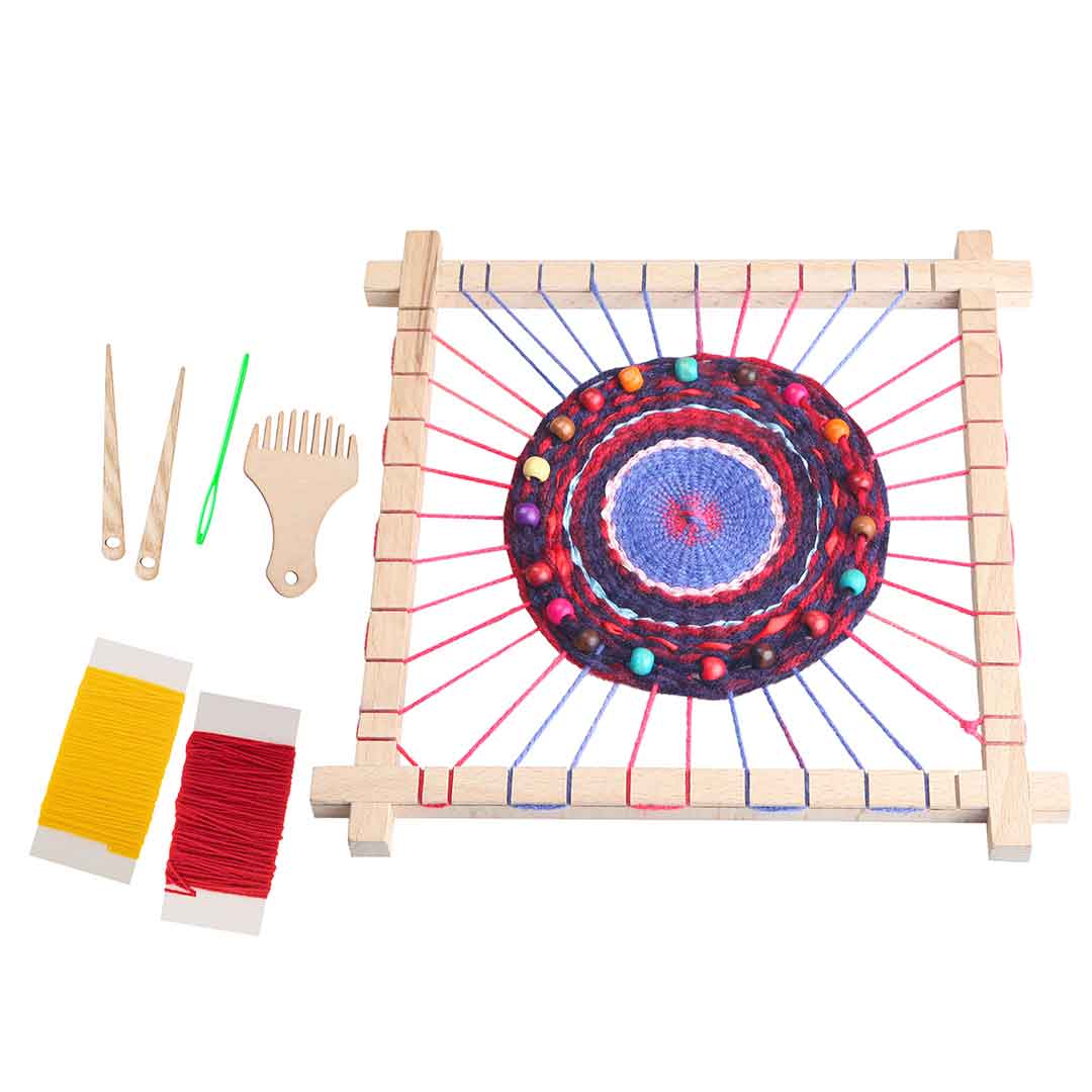 دار بافندگی چوبی ، شانه ، 2 عدد سوزن چوبی ، سوزن پلاستیکی ، 20 عدد مهره چوبی ، 2 رنگ کاموا و دفترچه راهنما