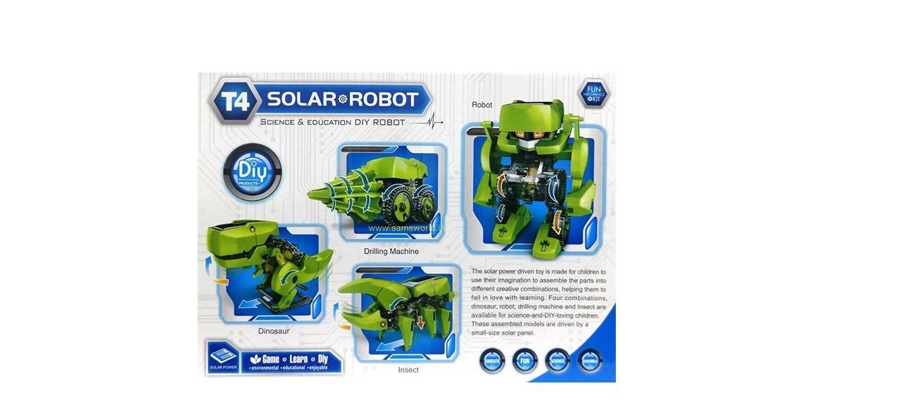 بسته سرگرمی رباتیک 4 در یک خورشیدی،دارای یک نقشه راهنمای شماتیک می باشد که بر طبق آن شما می توانید 4 ربات به شرح زیر را بسازید و از حرکت آنها لذت ببرید.شما می توانید در اوقاتی که نور خورشید در دسترس نیست،به وسیله یک لامپ 100 وات هم این ربات ها را به حرکت درآورید.