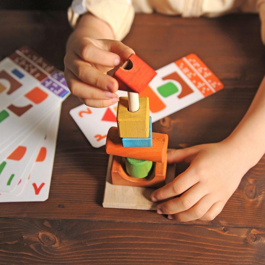 حالت اول: در این حالت که برای کودکان 2 سال به بالا مناسب است کودک با کمک فردی بزرگتر، مطابق با کارتهای الگو، اشکال را داخل میله چوبی قرار میدهد. با چینش صحیح هر کارت، کودک تشویق شده و حس اعتماد به نفس او تقویت میشود.