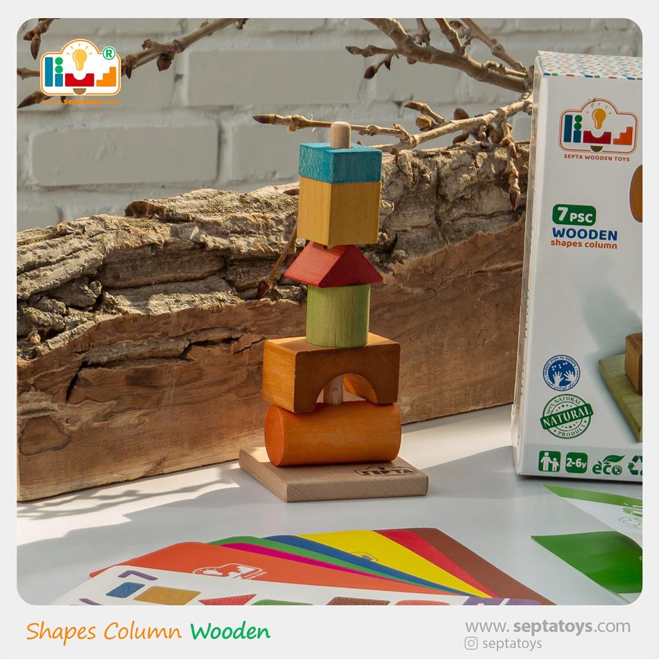 بازی فکری ستون اشکال چوبی سپتا شامل 7 قطعه چوبی در ابعاد و رنگهای مختلف است که با نام ستون اشکال برای گروه سنی 2 تا 6 سال طراحی شده است.
