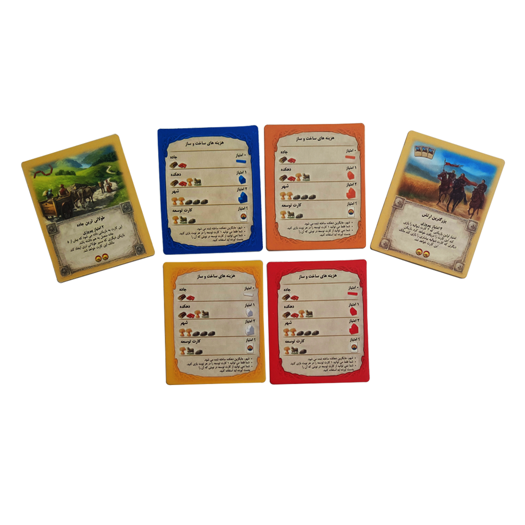 ترکیبی از منابع: غلات و پشم و سنگ معدن، آجر و الوار را بکار ببرین تا کارتهای موجود برای ساخت و ساز خریداری کرده و جادهها، سکونتگاهها و شهرها را بسازید. منابع خود را از طریق داد و ستدها، کارتها و یا پرتابهای شانسی تاس ( حتی خارج از نوبت خود) بدست آورید. اما مراقب باشید! کسی ممکن است جاده شمارا قطع کند یا یک حق انحصار خریداری کند.