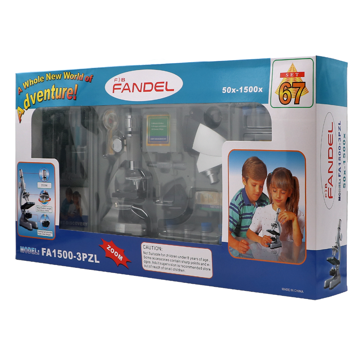 میکروسکوپ «fa1500-3PZL» با ابعاد 13 × 6 × 25 سانتیمتری بوده که برای کودکان بالای هفت سال طراحی شده است. میکروسکوپهای مختلف بزرگنماییهای متفاوتی دارند که با وجود عدسیهای گوناگون، تصویر نمونهی موردنظر چندبرابر میشود. میزان بزرگنمایی این مدل 50 تا 1500 برابر است. این میکروسکوپ دارای سه عدسی شیئی با قابلیت چرخش میباشد. عدسی های شیئی قابلیت بزرگنمایی با قدرت 50X-100X, 200X-400X, 600X – 1500X را دارند. منبع نوری این میکروسکوپ از دو عدد باطری قلمی که در پایه های این میکروسکوپ تعبیه میشود و یا آیینه ای که در زیر میکروسکوپ قرار دارد تامین می شود.
