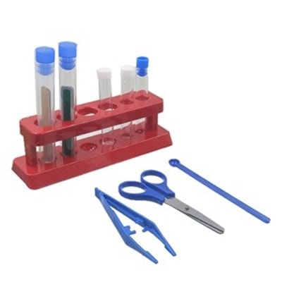 فیلتر رنگی – ذره بین – ۶ عدد لام – لامل – پنس – قیچی – پیمانه مدرج – قطره چکان – قاشق کوچک – قیف – ظرف نگهداری نمونه – ۲ عدد لوله آزمایش بلند – ۳ عدد لوله آزمایش کوتاه – فرچه تمیز کننده لوله آزمایش – جای لوله آزمایش – اسفنج – برچسب – نمک دریایی – نمونه بال پروانه – بروشور راهنمای فارسی