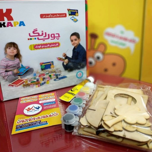 با استفاده از این محصول کمک آموزشی باعث هماهنگی بین حرکات چشم و دست کودک و افزایش مهارت حرکتی و دقت عمل کودک خود شوید . کودک شما با رنگ آمیزی هر یک از قطعات به سلیقه خود و چسباندن آنها در بخش مناسب روی کاردستی محصولی خلاقانه خلق میکند که میتواند از آن لذت ببرد. رنگ داخل جعبه کاملا بهداشتی است و برای کودکان مضر نیست. رنگ داخل جعبه با آب و مایع دستشویی کاملا پاک میشود. در هر بسته یک عدد آویز در و یک عدد قاب عکس به همراه گواش، چسب چوب و قلموی رنگ آمیزی قرار داده شده است.