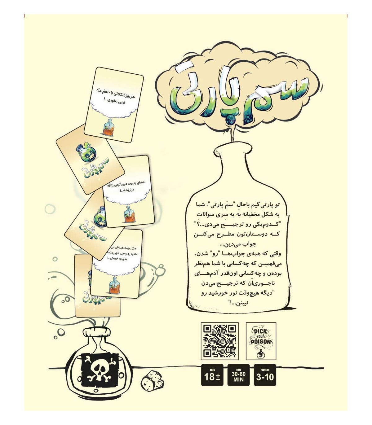 بازی سم پارتی بر اساس بازی خارجی Pick Your Poison طراحی شده است و اولین بازی گروه بی گیمز میباشد این بازی جذاب مناسب 3تا10نفره هست و برای گروه سنی بالای 18سال طراحی شده است همچنین مدت زمان بازی بین 30 الی 60دقیقه هست.